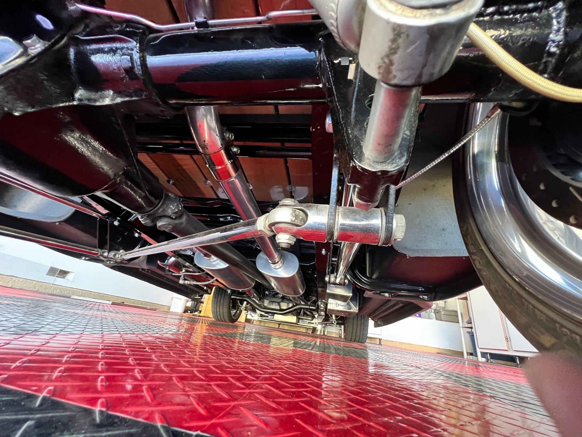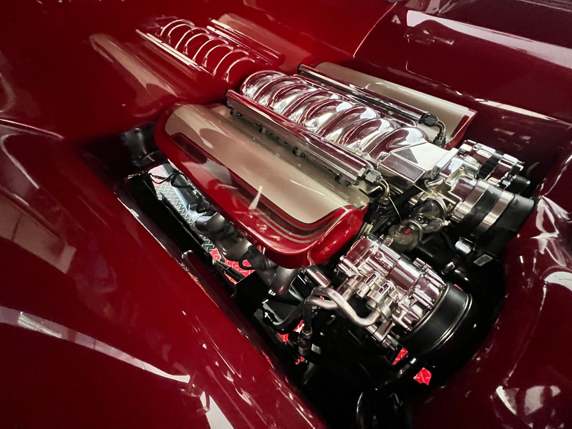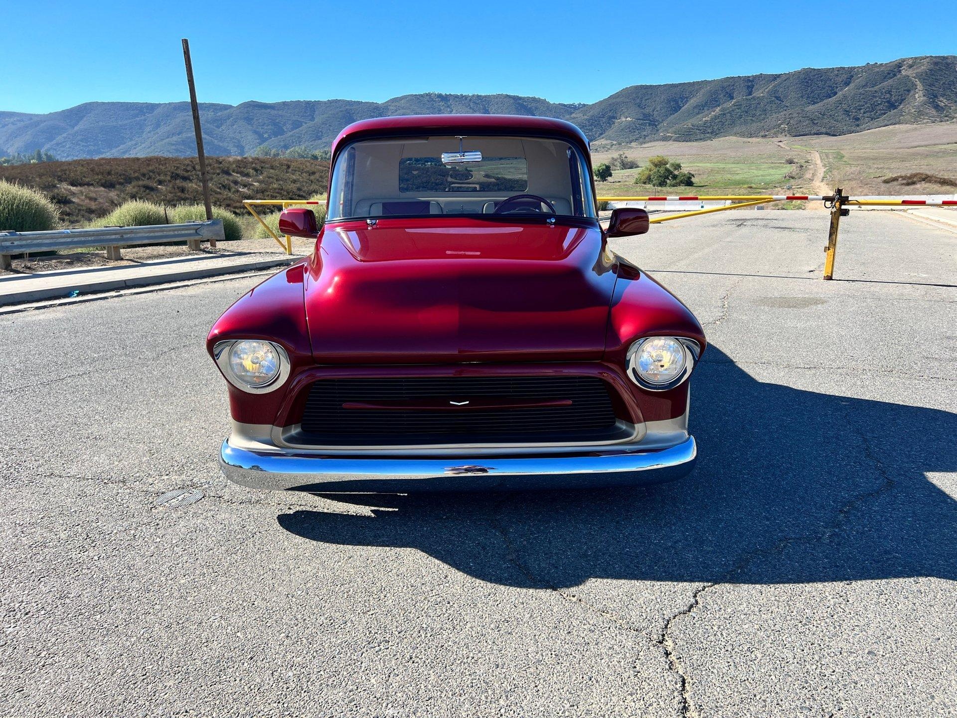 The 1956 Chevrolet Custom Truck is a stunning, one-of-a-kind build featuring an LS1 GM crate engine with only 2,725 miles and a 700R4 overdrive transmission with the same low mileage. The entire engine bay has been custom fabricated, including the firewall, polished chrome intake, valve covers, a custom color-coded chrome-top aluminum radiator, and unique hood hinges. Cooling is managed with dual electric fans.
