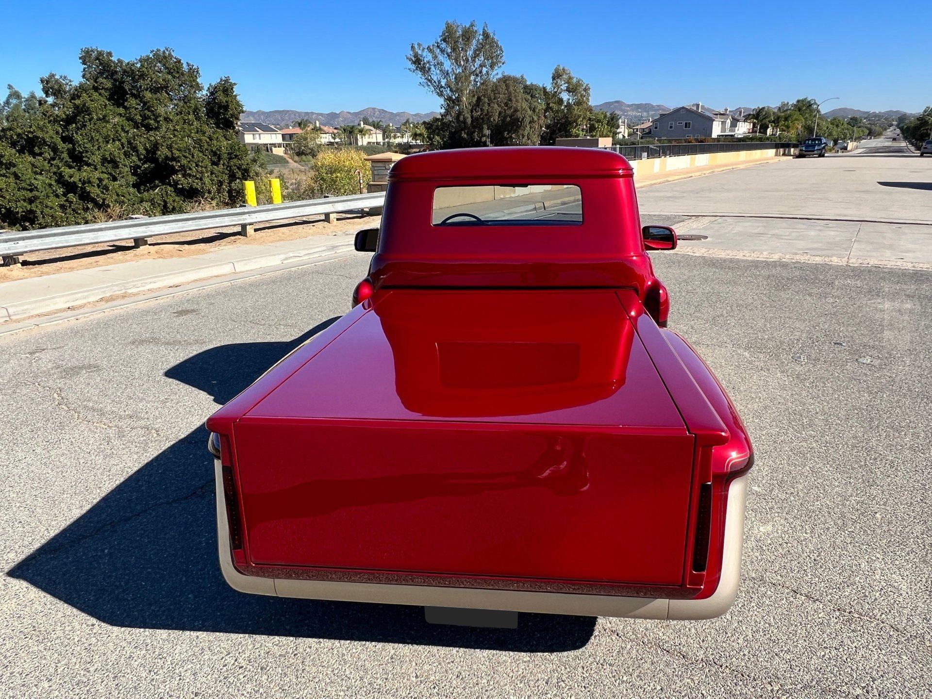 Inside, the truck boasts a luxurious full two-tone custom leather interior with chevron emblems and intricate custom stitching. Curley maple wood accents are integrated throughout the interior in the door panels, center console slider top, and the truck bed itself. The front bucket seats are power-adjustable with six-way controls, and the truck has power windows, door locks, side mirrors, and a power rear window (which is currently non-operational). A custom 1955 Chevy gauge cluster, fiber optic accent lighting, and a vintage air AC/heat system with digital controls provide comfort and style. The dash is fully custom fabricated, and a 6-inch digital display remote-controlled AM/FM CD stereo completes the interior package.