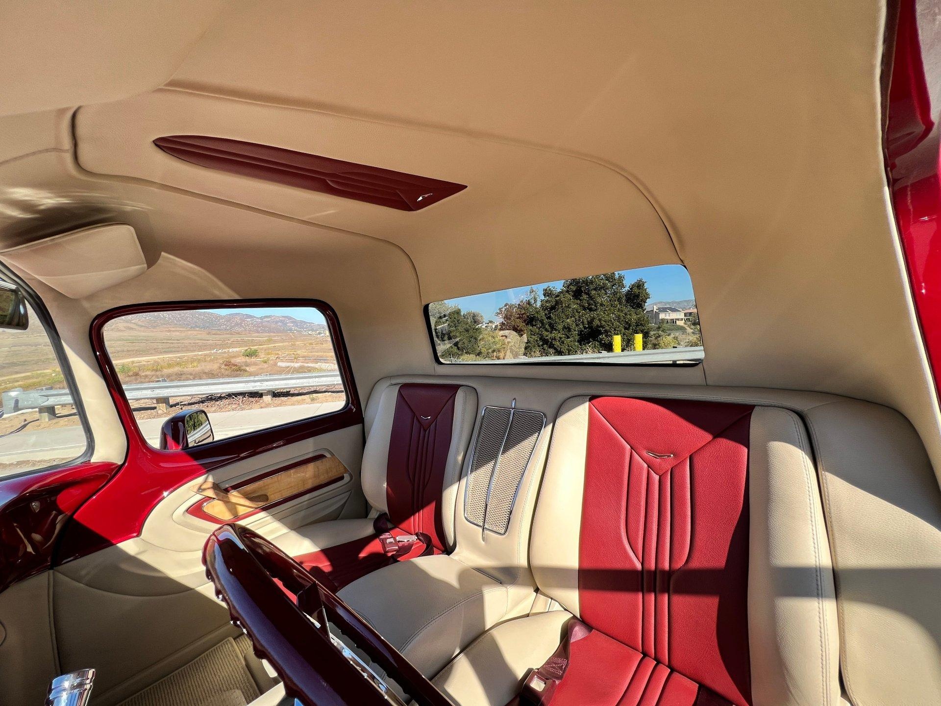 On the outside, the truck shines with a two-tone Matador Red and Champagne paint job featuring a mini metallic flake finish, awarded a perfect 10 out of 10. A pinstripe design wraps around the entire vehicle under clear coat, highlighting the immaculate bodywork. A custom floating front grill and specially made front wheels further enhance its unique look. The bed is crafted from Curley maple wood with extensive clear coats and is equipped with a power electric rear bed lift.